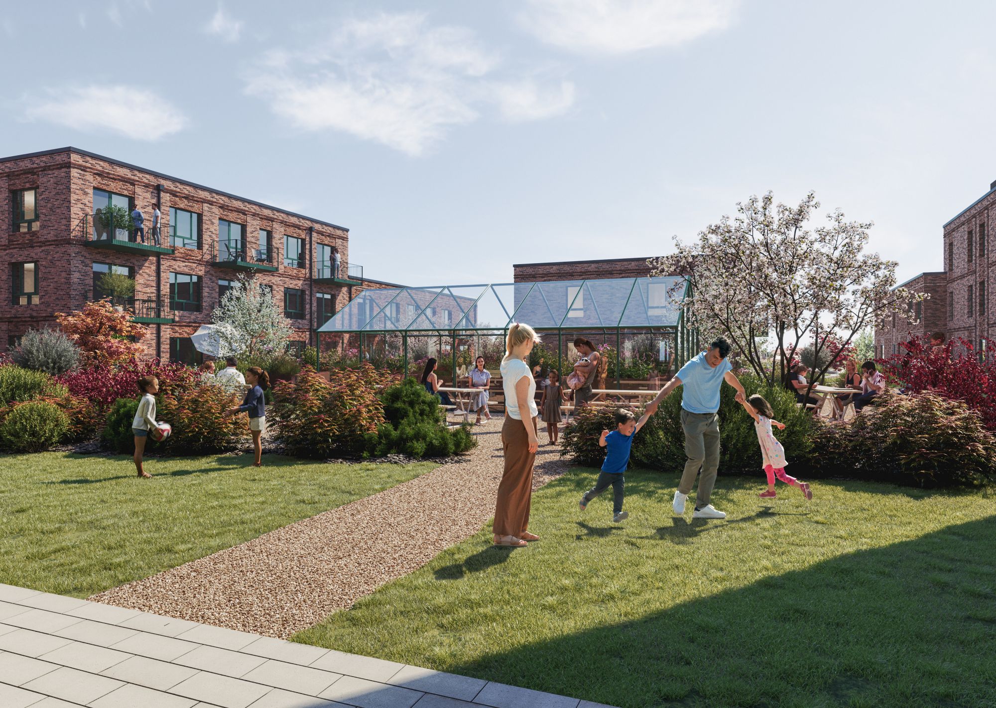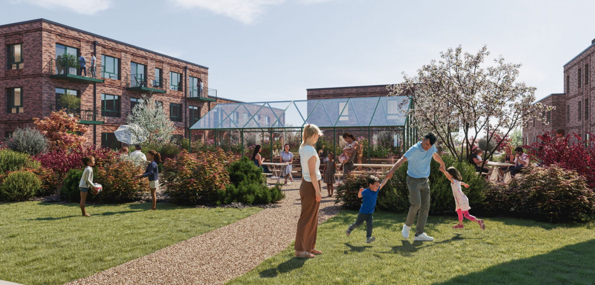 The green courtyard will serve as a natural oasis in the middle of the development, where residents can meet, play, and relax — while the underground parking ensures a calm and green courtyard environment.